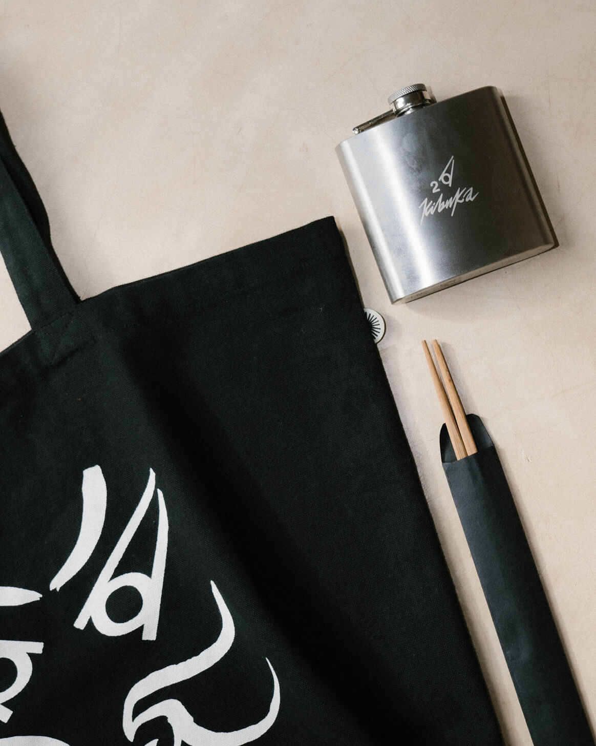 Petaca d'acer inoxidable emplenable. Gravada amb el logo de Kibuka 20 anys.